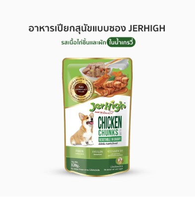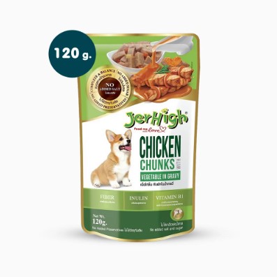 อาหารเปียกสุนัขแบบซอง JerHigh เนื้อไก่ชิ้นและผักในเกรวี่ (120 g) อุดมไปด้วยคุณประโยชน์จากวัตถุดิบที่ผ่านกระบวนการคัดสรรอย่างพิถีพิถัน