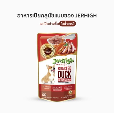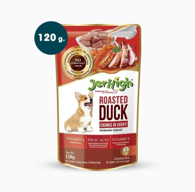 อาหารเปียกสุนัขแบบซอง JerHigh เป็ดย่างชิ้นในน้ำเกรวี่ (120 g) อุดมไปด้วยคุณประโยชน์จากวัตถุดิบที่ผ่านกระบวนการคัดสรรอย่างพิถีพิถัน